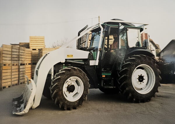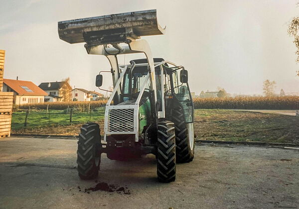 Damals: Ein Valmet 655-4 im seeländischen Vinelz mit Frontlader und Forstschutz über der Motorhaube.